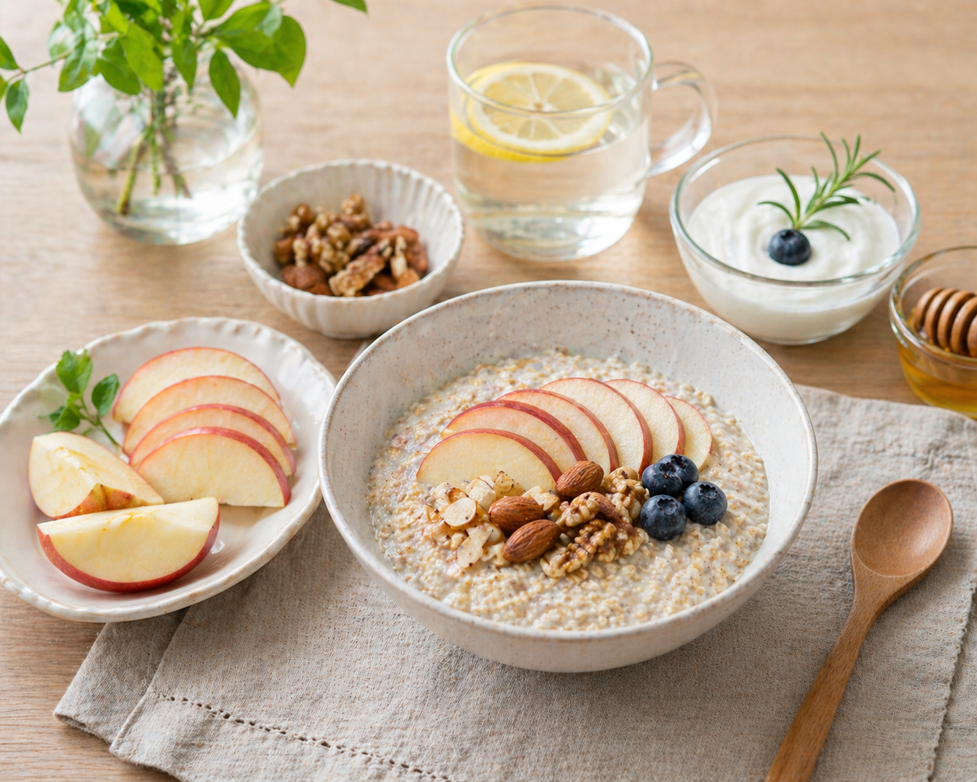 아침: 오트밀 1컵 + 견과류 한 줌 + 사과 반 개